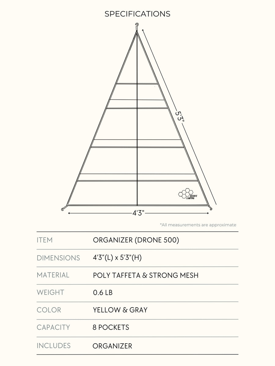 Designed to fit perfectly along any of the interior wall panels of your Drone, the Organizer transforms any of the interior wall panels of your Drone into an organizer system to keep your belongings tidy and accessible. The Drone hooks onto the circular hook attachments in your Drone, providing easy vertical access to your items while maximizing space. With six fine mesh pockets and two fabric pockets, you can store anything, from shoes to cooking utensils. Best of all, the Organizer rolls up perfectly and fits into your Drone carry bag at the end of your adventure.