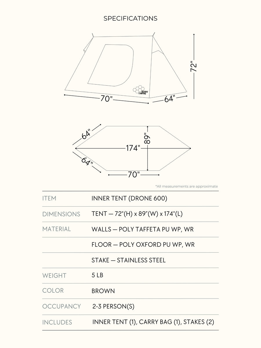 The Drone 600 fits two Inner Tents for a convertible sleeping pod experience with plenty of space for your belongings.